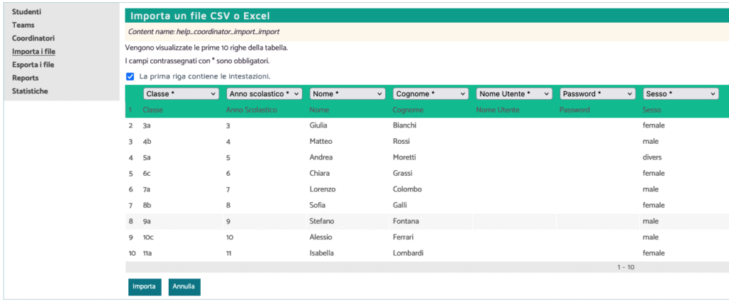 - Il modello richiede informazioni per le seguenti categorie (titoli colonne): Classe, Anno scolastico, Nome, Cognome, Nome utente, Password e Sesso.