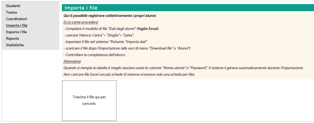 - Menu sinistro → «Import i file» e selezionare/spostare il file.